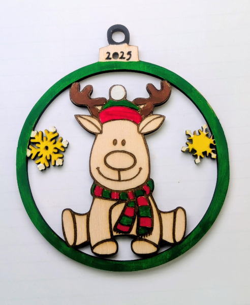 Cute little moose Christmas ornament. Laser cut from basswood. Hand painted. Dimensions are: 3" ornament.