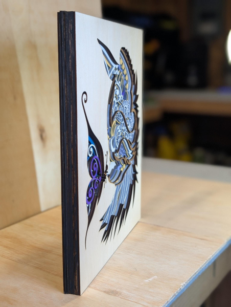 Beautiful Cat & Butterfly wall hanging. This unique item has very eye catching detail and will be a conversation piece. Add a touch of elegance to your wall funishings. Laser cut from 7 layers of basswood and hand painted.