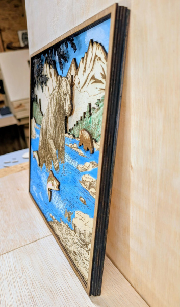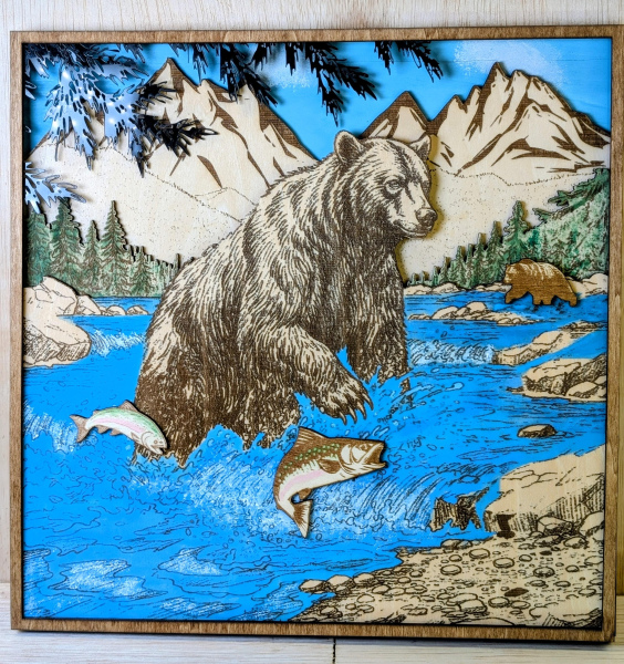 5 Layer Nature scene Design of a bear fishing for salmon. wall hanging, multi-layer laser design. Hunter's decor. Hand painted. Rustic decor.