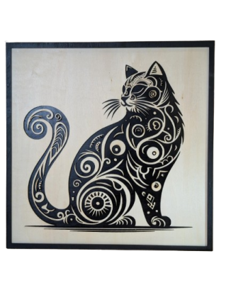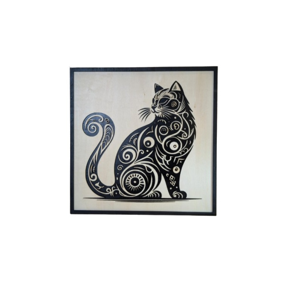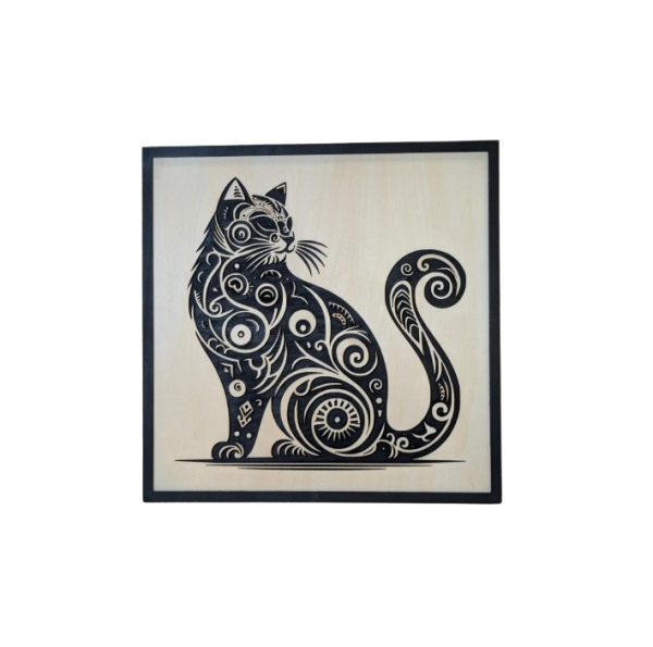 Multi Layer ( 3 Layer ) decorative cat wall hanging. Home Decor. Laser cut. Top layer is natural basswood. Background layer and frame are painted black.