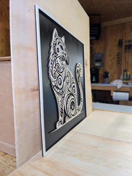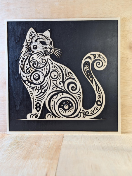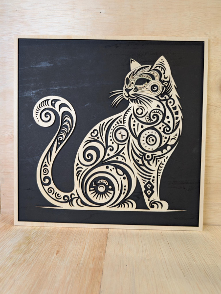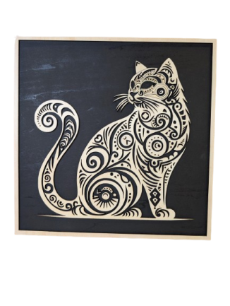 Multi Layer ( 2 Layer ) ornate cat wall hanging with black background. Home Decor. Wall hanging. Laser cut. Natural basswood top layer and frame with background painted black.